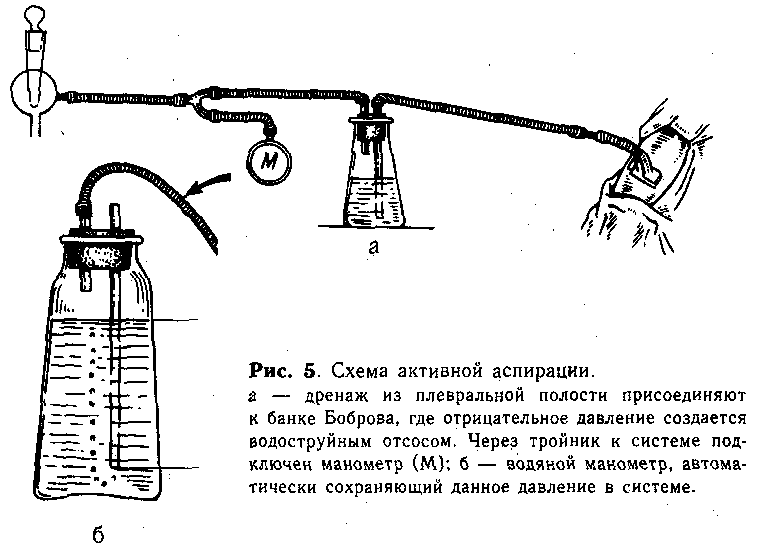 С помощью аппарата активной аспирации в плевральной полости создают отрицательное давление до 15—25 см вод. ст. и более. При наличии внутреннего бронхиального свища необходимо усиливать работу