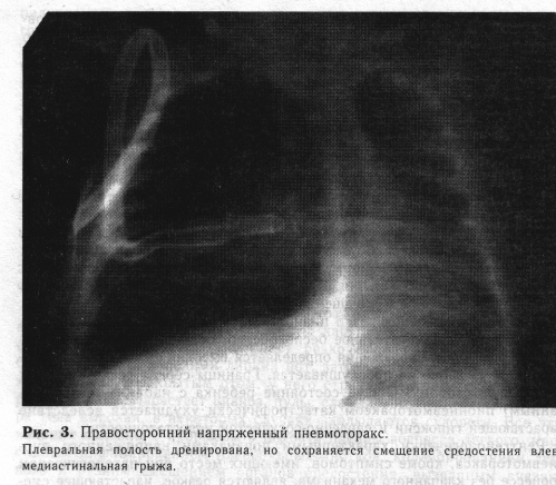 Рентгенологически характерными признаками напряженного пио-пневмоторакса, кроме симптомов, имеющих место при патологическом процессе без клапанного механизма, являются резкое, нарастающее смещение органов средостения в здоровую сторону и наличие медиасти-нальной грыжи (рис. 3).