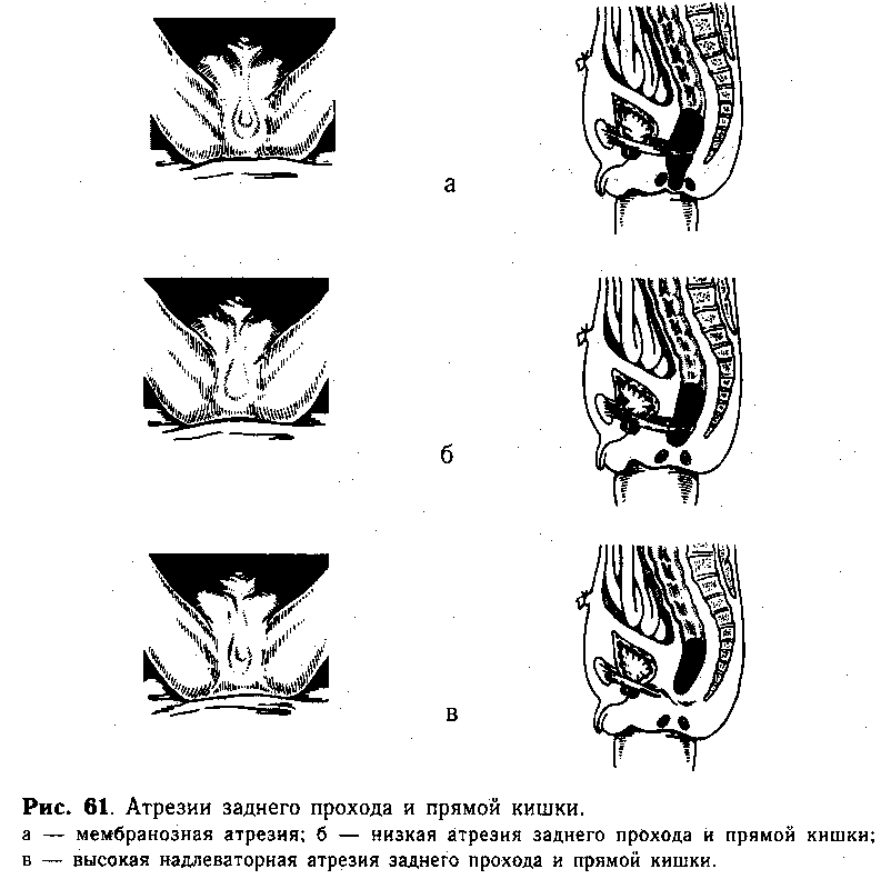 Клиническая картина зависит от вида порока развития. Атрезии анального отверстия и прямой кишки обычно выявляют при первом осмотре новорожденного в родильном доме. При клиническом обследовании необходимо установить характер недоразвития заднего прохода и прямой кишки. Если осмотр ребенка после рождения по каким-либо причинам не был произведен, то к концу суток новорожденный начинает беспокоиться, появляется обильное срыгивание, рвота содержимым желудка, затем — желчью, а в поздние сроки — меконием. Живот постепенно становится вздутым, видны растянутые кишечные петли. Меко-ний и газы не отходят. Развивается картина низкой кишечной проходимости, появляются одышка, цианоз, обезвоживание и резкая интоксикация. Без оперативного вмешательства больной погибает спустя 4— 6 дней после рождения.