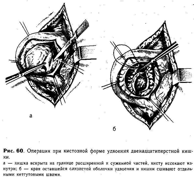 При локализации удвоения в дистальных отделах двенадцатиперстной кишки мы полностью удаляем слизистую оболочку, покрывающую кисту изнутри. После вскрытия продольно рассекают выступающее изнутри удвоение. Тупым путем отслаивают слизистую, покрывающую изнутри кисту. Края последней иссекают, накладывают на мышечную оболочку несколько сближающих кетгутовых швов и сшивают края слизистой оболочки в продольном направлении над местом бывшей кисты. Двенадцатиперстную кишку закрывают в поперечном направлении двухрядным швом. Операция полностью предотвращает осложнения (пептические язвы, кровотечения), связанные с возможным наличием слизистой оболочки желудочного типа. Однако подобное вмешательство применимо только при сравнительно небольших размерах удвоения.