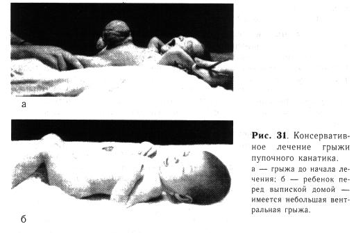 После появления грануляций (7—10-й день лечения) применяют ежедневные гигиенические ванны. Краевая эпителизация и рубцевание ведут к уменьшению грыжевого выпячивания. Этому способствует тугое бинтование, применяемое в процессе лечения. Рана заживает к 40— 50-му дню после рождения ребенка (рис. 31, а, б).