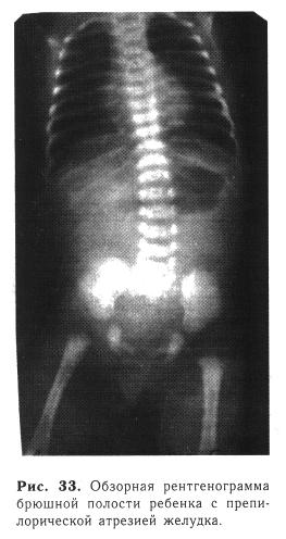 Рентгенологическое исследование — один из основных методов диагностики. На обзорной рентгенограмме брюшной полости при вертикальном положении отмечаются большой газовый пузырь и уровень жидкости, соответствующие растянутому желудку, в петлях кишечника газа нет (рис. 33). Иногда выявляют «немой живот» — отсутствие газа на всем протяжении желудочно-кишечного тракта. При наличии подобной рентгенологической картины другие методы исследования обычно не требуются. Некоторые хирурги предлагают вводить в желудок йодолипол — при атре-зии желудка наблюдается выпячивание пилорической мембраны в просвет двенадцатиперстной кишки.