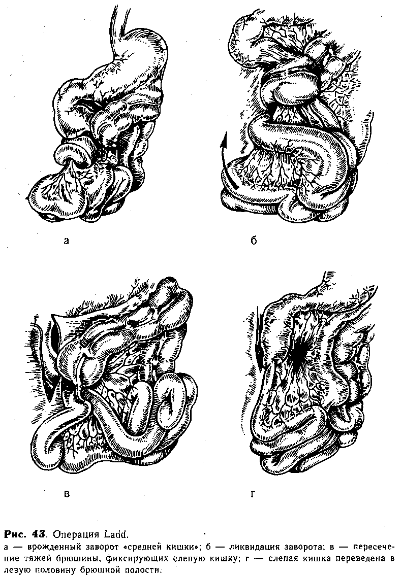 Врожденный заворот «средней кишки» и непроходимость двенадцатиперстной кишки от сдавления высоко расположенной слепой обычно оперируют по методике, предложенной Ladd.