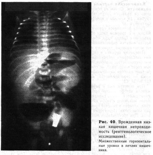 Рентгенологическое исследование начинают с обзорных снимков брюшной полости. На рентгенограммах определяются раздутые петли кишечника (рис. 40) с множественными неравномерными горизонтальными уровнями (непроходимость дистальных отделов подвздошной и толстой кишки) или несколькими крупными газовыми пузырями с широкими уровнями (непроходимость тощей или подвздошной кишки, мекониальная непроходимость). При подозрении на низкую кишечную непроходимость мы проводим исследование с водорастворимым контрастирующим веществом, вводимым в прямую кишку шприцем через катетер. При низкой непроходимости на рентгенограммах видна заполненная контрастирующим веществом резко суженная толстая кишка. Перфорация расширенного отдела кишки выше места непроходимости рентгенологически обычно выявляется по наличию свободного газа в брюшной полости.