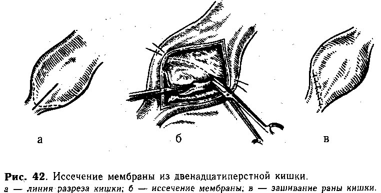 Мембранозную непроходимость двенадцатиперстной кишки ликвидируют путем энтеротомии и иссечения мембраны.