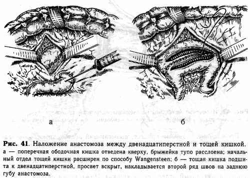ответственно длине анастомоза, отступя от линии шва на 2—3 мм. Для предупреждения загрязнения брюшной полости пользуются аспиратором. Задние губы анастомоза сшивают краевым непрерывным швом (рис. 41, б). Далее в просвет тощей кишки вводят катетер и над ним соединяют швом по Шмидену передние губы анастомоза (катетер удаляют перед окончанием переднего шва, и последние 2—3 стежка накладывают без катетера). Передние края анастомоза укрепляют вторым рядом сероз-но-мышечных швов, приводящую петлю тощей кишки фиксируют несколькими швами к передней поверхности двенадцатиперстной. Края брыжейки подшивают вокруг анастомоза.
