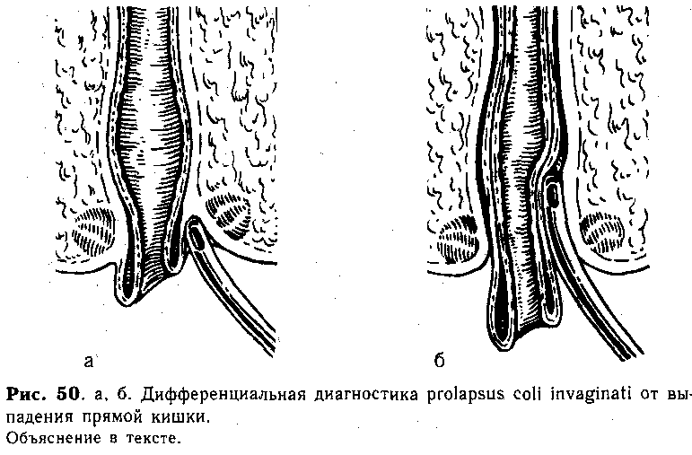 Выпадение толстокишечного инвагината через прямую кишку приходится дифференцировать от выпадения прямой кишки. В отличие от инвагинации, выпадение прямой кишки не сопровождается болевыми приступами и рвотой. Кроме того, при осмотре выпавшей кишки отчетливо определяется, что ее слизистая оболочка непосредственно переходит в кожу, окружающую задний проход (рис. 50, а). При инвагинации между выпавшей кишкой и кольцом заднего прохода имеется борозда, через которую можно провести палец или зонд в ампулу прямой кишки (рис. 50, б).