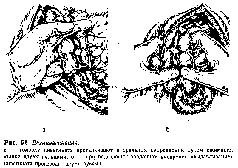 При многоцилиндровой инвагинации вначале расправляют толстокишечную часть, затем под-вздошно-ободочное внедрение. Торопливость и применение значительной силы при этом ответственном этапе операции недопустимы. Следует помнить о том, что самым трудным местом при дезинвагинации подвздошно-ободочного внедрения является область ущемляющего кольца илеоцекального клапана. При дезинвагинации не следует подтягивать за отрезок кишки, расположенный оральнее шейки инвагината. Это грозит излишней травмой и разрывами серозной оболочки внедренной кишки. Исключение из этого правила допустимо только при расправлении выпавшего через задний проход инвагината. В этих случаях хирург захватывает внедренную толстую кишку со стороны брюшной полости и осторожно подтягивает, а ассистент одновременно вправляет инвагинат в прямую кишку, надавливая на выпавшую часть салфеткой, пропитанной вазелиновым маслом. После того, как произошло вправление выпавшего инвагината и головка его определяется в толстой кишке, последнюю выводят в рану. Дезинвагинацию заканчивают обычным способом.