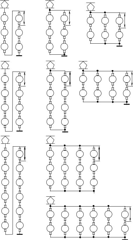 Рис. 3.3. Схемы соединения ТД на шестиосном (а), восьмиосном (б) и двенадцатиосном (в) электровозах постоянного тока