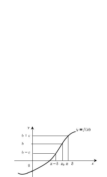 Теперь рассмотрим функцию y = f(x) непрерывного аргумента x (рис. . ) и предположим, что x неограниченно приближается к числу x0 (x → x0). При этом может оказаться, что соответствующее значение f(x) неограниченно приближается к некоторому числу b. В этом случае говорят, что число b есть предел функции f(x) при (x → x0).