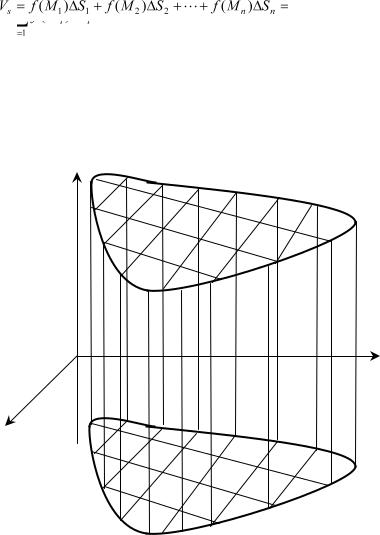 Через f (M1), f (M2), …, f (Mn) обозначим значения функции z = f (x, y) в выбранных нами точках. Затем составим сумму произведений f (Mi)DSi, которую обозначим Vs: