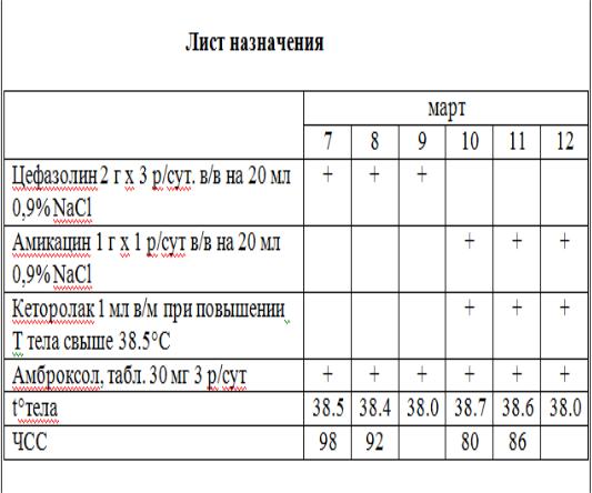 Общий анализ крови (7.03): Нb – 145 г/л, лейкоциты – 18×109/л, эритроциты – 4,5×1012/л, тромбоциты – 240×109/л, палочкоядерные – 12%, лимфациты – 20%, нейтрофилы – 74%, эозинофилы – 1%, моноциты – 3%, СОЭ – 25 мм/ч.