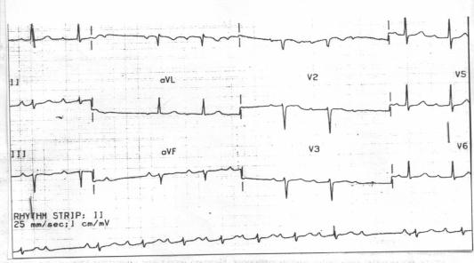 Объективно: состояние средней степени тяжести, акроцианоз, отѐков нет. В нижних отделах лѐгких небольшое количество незвучных мелкопузырчатых хрипов. Тоны сердца глухие, аритмичные, ЧСС - 42 удара в минуту, Ps - 42 в минуту. АД - 110/65 мм рт. ст. Живот мягкий, безболезненный. Печень на 2 см ниже рѐберной дуги, край еѐ ровный, закруглѐнный, слегка болезненный при пальпации.