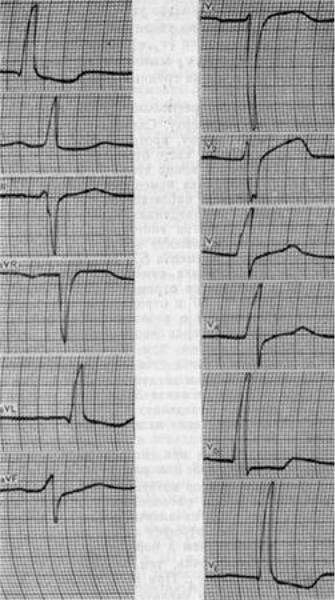 Из анамнеза: четыре года назад перенѐс инфаркт миокарда. Через год стали появляться ангинозные боли при обычной физической нагрузке. Неделю назад ощутил перебои в работе сердца, инспираторную одышку, отметил кратковременные эпизоды потери сознания, что и явилось причиной госпитализации.