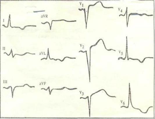 ЭКГ: смещение электрической оси влево, глубокий з. S в V3, высокий з. R в aVL, з. R V5> з. R V4, слабо (-) з. Т в V1-V6.