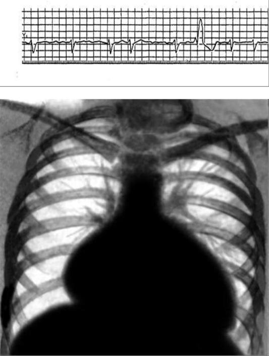 Объективно: состояние средней степени тяжести, положение в постели вынужденное с приподнятым головным концом. Кожные покровы бледные, акроцианоз, цианоз губ. Отѐки до средней трети голеней. Одышка в покое (ЧД - 24 в минуту). Дыхание везикулярное, мелкопузырчатые влажные хрипы в нижних отделах лѐгких. Отмечается пульсация и набухание шейных вен. АД - 100/70 мм рт. ст. Левая граница относительной сердечной тупости смещена до передней подмышечной линии. Тоны сердца глухие, 105 в минуту, ритм неправильный, акцент II тона на лѐгочной артерии; выслушивается систолический шум на верхушке без проведения, над мечевидным отростком. Печень на 3 см ниже края рѐберной дуги, поверхность еѐ ровная, плотная, слегка болезненная при пальпации, край закруглѐн.