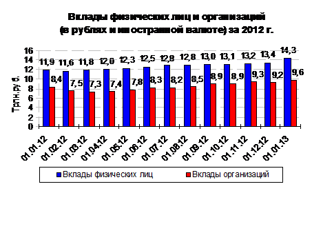 Объем депозитов и прочих привлеченных средств юридических лиц за 2012 год возрос на 15%, до 9619,5 млрд. рублей. Их доля в пассивах банковского сектора снизилась с 20,1% на 01.01.12 до 19,4% на 01.01.13.