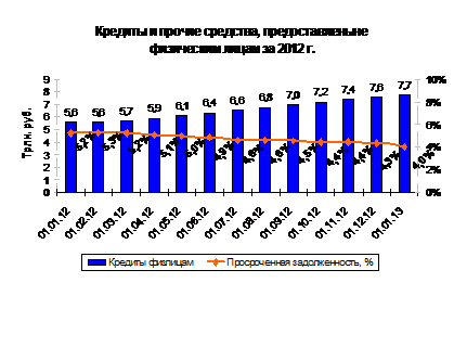 Их доля в активах банковского сектора повысилась с 13,3% на 01.01.12 до 15,6% на 01.01.13, а в общем объеме кредитных вложений банков - с 19,3% до 22,8% соответственно. Объем просроченной задолженности по этим кредитам за 2012 год возрос на 7,6%. Ее удельный вес в общем объеме кредитов физическим лицам снизился с 5,2% на 01.01.12 до 4% на 01.01.13.