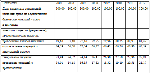 За 2005-2011г. число кредитных организаций уменьшилось на 321 единицу. Поменялась структура кредитных организаций по выданным лицензиям с 2005 по 2011г.: с 89,68% до 81,49% уменьшилось число кредитных организаций, имеющих лицензии на привлечение вкладов населения; с 64,59% до 67,59% увеличилось число кредитных учреждений, имеющих лицензии на осуществление операций в иностранной валюте; увеличилось с 23,94% до 27,91% число кредитных учреждений, имеющих генеральные лицензии, а также увеличилось число кредитных учреждений, имеющих лицензии на проведение операций с драгметаллами- с 14,01% до 21,17%.