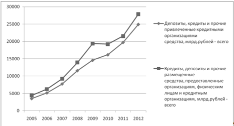 Кредиты, депозиты и прочие размещенные средства, предоставленные организациям, физическим лицам и кредитным организациям, на начало 2012г. увеличились на 23538 млрд. руб. или на 538,26% по сравнению с началом 2005г.