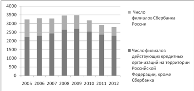 За 2005-2011г. уменьшилось число филиалов кредитных учреждений на 431 единицу, а также число филиалов Сбербанка РФ почти в 2 раза на 487 единиц, что говорит об объединении филиалов банков в более крупные филиалы, а также о снижении числа кредитных учреждений.