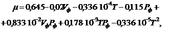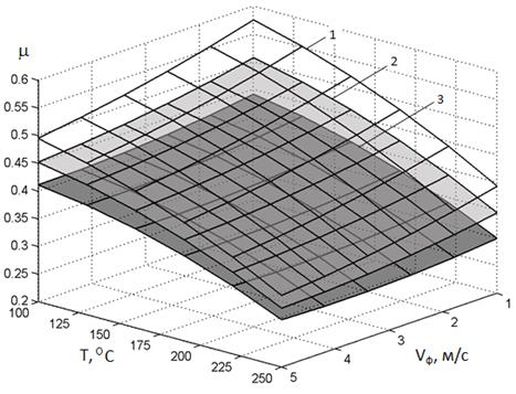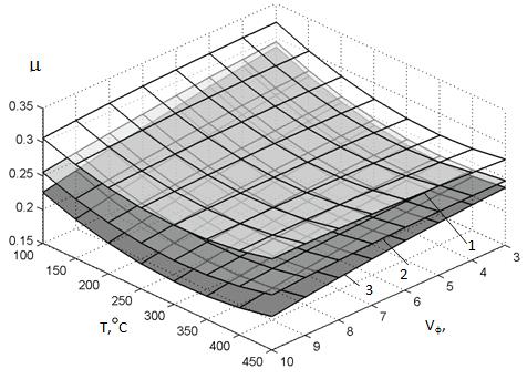 На рис. 2.6 наведений графічний варіант фрикційної характеристики гальмового механізму (2.39) з виділенням трьох рівнів тиску, яка дозволяє визначити дійсне значення еквівалентного коефіцієнту тертя при довільних комбінаціях температури та швидкості ковзання і виділених рівнях тиску у контакті.