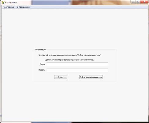 Но перед тем как начать работать с программой в форме выводиться окно авторизации. Оно нужно для разделения пользователей на администраторов и непосредственно работников. Для входа в программу с правами администратора следует ввести логин и пароль, и далее нажать кнопку «Вход». В режиме администратора будут доступны дополнительные функции созданные для отладки программы на уровне разработки и аппгрейда программы.