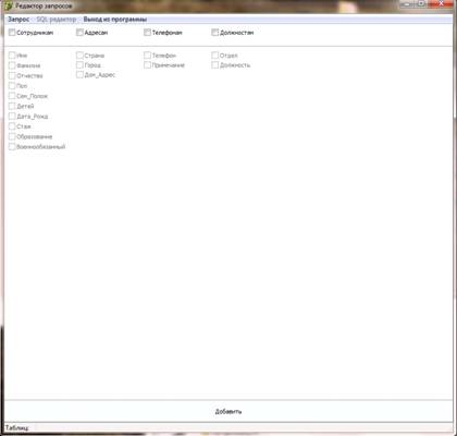 Редактор запросов открывается в отдельном окне. Вызвать его можно через База данных\Новый запрос или же загружая уже созданный ранние запрос через База данных\Открыть запрос. При создание нового запроса открывается форма «Фильтр запроса» для того чтобы пользователь отметил таблицы и поля, которые будет использовать в запросе. Так же можно сразу воспользоваться шаблонами находящиеся в пункте меню Запрос\Шаблон\... .
