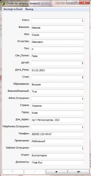 Составления запросов, для отыскания необходимой информации в базе данных и дальнейшей генерации отчёта по этому запросу. А также экспорт запросов в Excel; база данные кадры запрос