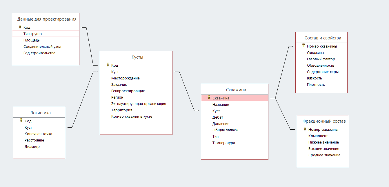 В таблице под названием «Скважины», содержатся индивидуальные данные по каждой скважине: ее наименование, тип (нефтяная, газовая, нефтегазовая), дебет, рабочее давление и температура продукта скважины, принадлежность ее к кусту.