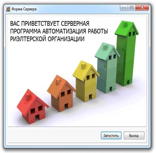 Приложение «Автоматизация работы риэлтерской организации», разделено на два самостоятельных приложения, одна из них клиентская часть, друга серверная часть. Оба приложения запускаются двойным щелчком по соответствующему ярлыку на рабочем столе.