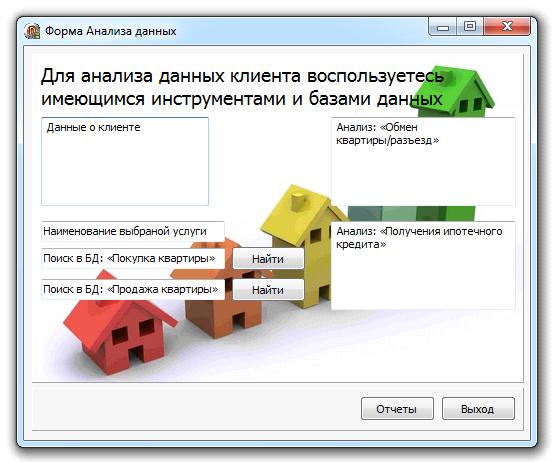 Разработанная система «Автоматизации роботы риэлтерской организации» полностью удовлетворяет требованиям, возложенным на нее: возможность ввода и изменения данных о клиенте, качественный анализ полученной информации, бесперебойная работа всех отделов предприятия, уменьшение сроков работы над заказом, формирование отчетов.