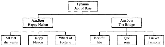 Несмотря на то, что в атрибутах, описывающих песню, нет названия альбома, глядя на дерево по линиям связи можно сказать, какая песня принадлежит альбому. Благодаря линиям связи можно определить принадлежность альбома группе. Из данной иерархической структуры можно узнать: