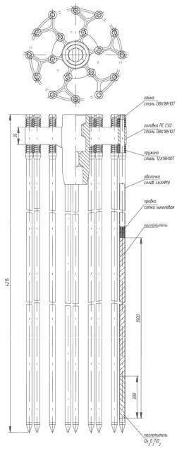 На рис. 7.3 показан вид ПС СУЗ. Вес ПС СУЗ 18.5 кг. Перемещаются ПЭЛы в направляющих трубах ТВС 13,0–1,0 мм, радиальный кольцевой зазор между ПЭЛ и внутренней поверхностью направляющей трубы 0,9 мм.