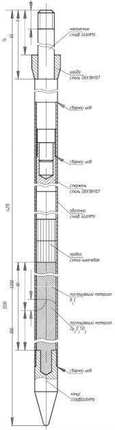На рис. 7.4 показана схема поглощающего элемента. Диаметр оболочки поглощающего элемента 8,2 мм. Материал оболочки: сплав 46ХНМУ или сталь 06Х18Н10Т. Поглощающий материал – комбинированный по высоте