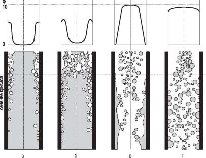 Кризис в потоке сильно недогретой жидкости (рис. 8.8, а). Интенсивность теплообмена исключительно велика. Пузыри пара растут и схлопываются вблизи стенки. Кризис наблюдается при высоких плотностях теплового потока. Распределение истинного паро-