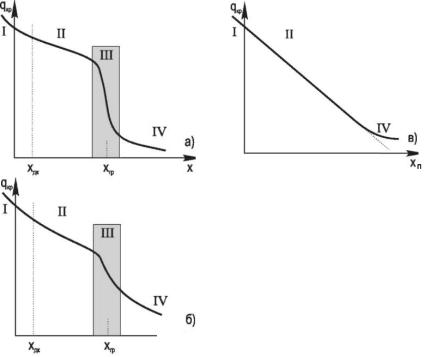 Рис. 8.9. Зависимость критического теплового потока от паросодержания: хдк – начало дисперсно-кольцевого режима; хп – предельное паросодержание; хгр – граничное паросодержание. Область граничного паросодержания: I – кризис, связанный с переходом пу-
