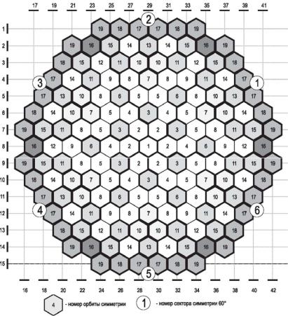 Рис. 8.20. Картограмма разбиения активной зоны ВВЭР-1000 по орбитам симметрии