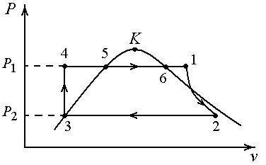 Цикл состоит из двух адиабат (1-2, 3-4) и двух изобар (4-5-6-1 (P=P1), 2-3 (P=P2)). В области влажного пара каждая изобара является одновременно и изотермой (5-6, 2-3); T1=Tн(P1), T2=Tн(P2).