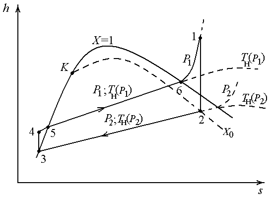 Параметры состояния рабочего тела определяются в точке 4 по таблицам для жидкости в недогретом состоянии (P=P1); в точке 1 по таблицам для пара в перегретом состоянии (P=P1); в точках 3, 5, 6 по таблицам для вещества на линии насыщения; в точке 2 по зависимостям для влажного насыщенного пара (P=P2, T=Tн(P2)). Компактно вся эта информация содержится на h-s-диаграммах.