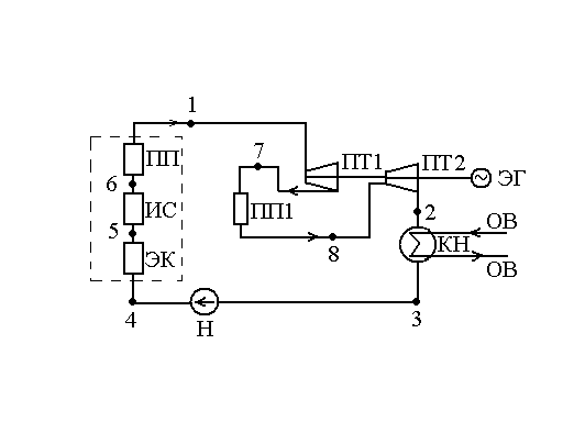 Отработавший адиабатно на лопатках первой ступени влажный пар (состояние в точке 7: X<1; P2<P*<P1) поступает на промежуточный пароперегреватель ПП1. При том же давлении P* (изобарно) он переводится в перегретое состояние (точка 8) и поступает на лопатки второй ступени турбины ПТ2.