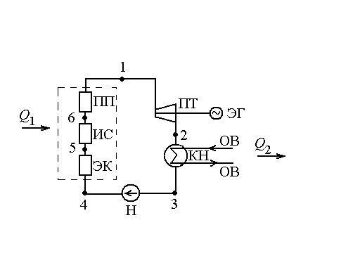 Рис. 8.1. Схема установки, реализующей цикл Ренкина: ПТ – паровая турбина; ЭГ – электрогенератор; КН – конденсатор; ОВ – охлаждающая вода; Н – насос; ЭК – экономайзер; ИС – испаритель; ПП – пароперегреватель; Q1 – подведенное тепло; Q2 – отведенное тепло