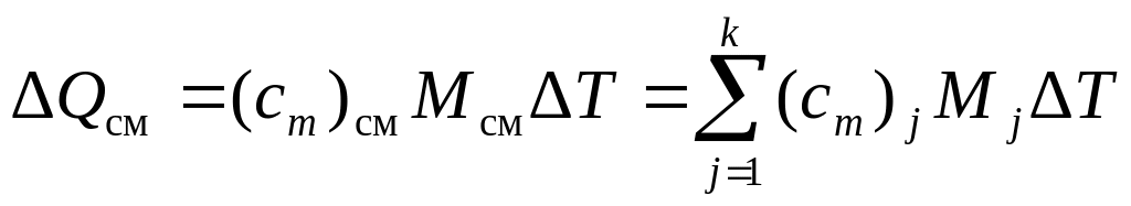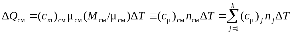 Для смеси идеальных газов или любой другой ее компоненты, имеющей массу M (кг), содержащей n киломолей и занимающей объем V (м3), изменение количества тепла Q и соответствующее изменение температуры T связаны уравнениями (сm, сμ , с* – средние значения)