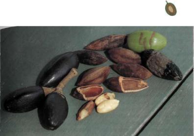 имеет окраску от светлой зеленовато-жел той до коричневой; она плотная, волокнис тая, умеренно сочная, с вяжущим вкусом, в толщину достигает 4 мм. Коричневая кос точка деревянистая, в форме широкого или узкого веретена, со слабо выраженными тремя гранями и неглубокими продольны ми бороздками, имеет очень толстую (до 4 мм) скорлупу и достигает размеров 7 х 3,5 см. Она содержит 3 продольные каме ры, 2 из которых очень узкие и пустые. В большой камере развивается веретенооб разное, со слабо выраженными тремя гра нями ядро в коричневой оболочке, изнутри белое, имеющее плотную, как орех, конси стенцию и очень приятный вкус.