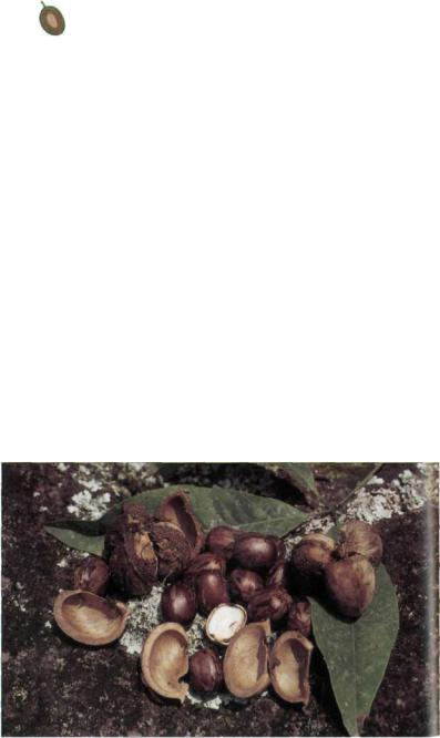Плод. На деревьях таитянского ореха вы растают односемянные бобы почковидной формы размером до 4 х 2,7 см. Их волок нисто-деревянистая кожура к моменту со зревания семян распадается на две створки в форме ушек. Семя имеет форму овала или широкого яйца и размеры до 2,8 х 2 см. Его кожисто-деревянистая, гладкая оболочка толщиной 1 мм снаружи блестящая и ко ричневая с продолговатыми белыми пятна