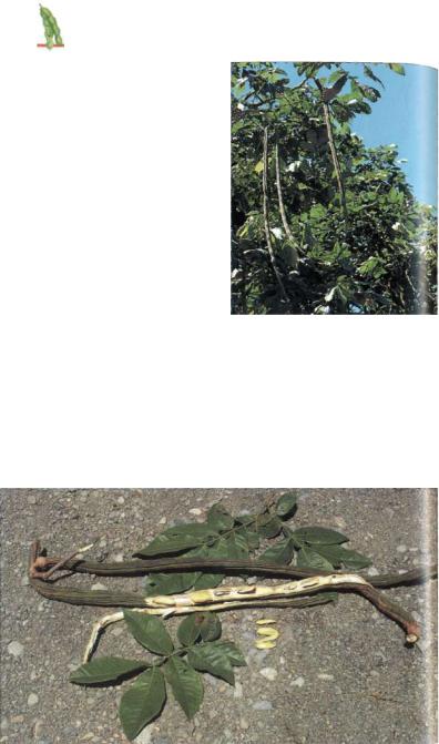 Над ними возвышается пучок длинных ты нок, сросшихся в нижней части в трубку. Плод. Свисающие плоды сахарного горошка представляют собой цилиндрические, покрытые глубокими продольными бороздами, часто закрученные и загнутые, с тонким бархатистым волосяным покровом, матовые, коричнево-зеленые бобы размером 1 мх4см . Кожура твердокожистая, толщиной ок. 2 мм. Внутри находятся семена в форме фасолин с блестящей крас но-коричневой кожурой, размером 5,5 х 2,5 х 1,2 см, окруженные белой прочной оболочкой и утопленные в белую, сочногубчатую, сладкую, ароматную пульпу.
