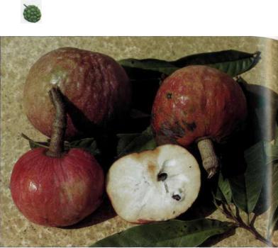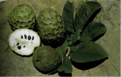 Плод. Сборная ягода анноны колючей имеет слегка уплощенную яйцевидную, гру шевидную, почковидную или сердцеви дную форму, часто бывает изогнута. Размер ее может достигать 35 х 20 см, масса - 6 кг. Кожура темно-зеленая, с беловато-зелены ми крапинками, горькая, разделена на ром бовидные сегменты, на каждом из которых имеется мягкая, длиной до 1 см, конусооб разная, загнутая колючка. Мякоть плода бе лоснежная, к моменту полного созревания очень мягкая, волокнисто-кашеобразная, сочная и имеет кислый или кисло-сладкий вкус со специфическим ароматом. На воз духе она быстро становится коричневой. Плоды заключают в себе многочисленные фасолевидные, блестящие, темно-корич невые или черные семена (2 х 1 см).