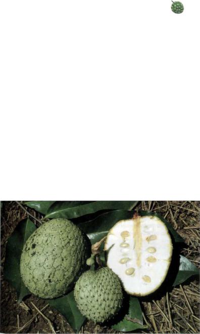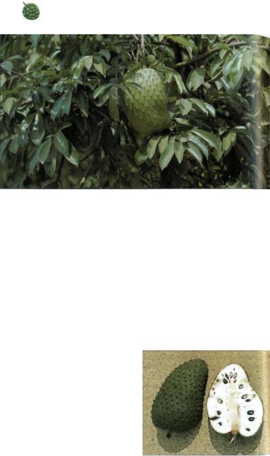 Аннона колючая - небольшое, вечнозеленое, густо ветвящееся дерево высотой до Ю м , молодые ветви которого имеют цвет ржав чины и покрыты волосками. Листья разме ром 2 0 x 7 см, очередные, двухрядно рас положенные, грубокожистые, с верхней стороны блестящие, темно-зеленые, с ниж ней стороны матово-зеленые, с цельным краем, обратно-яйцевидные, с вытянутым тупым кончиком и клиновидным основани ем, длина черешков - до 1 см.