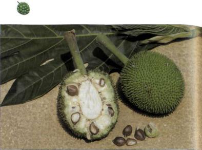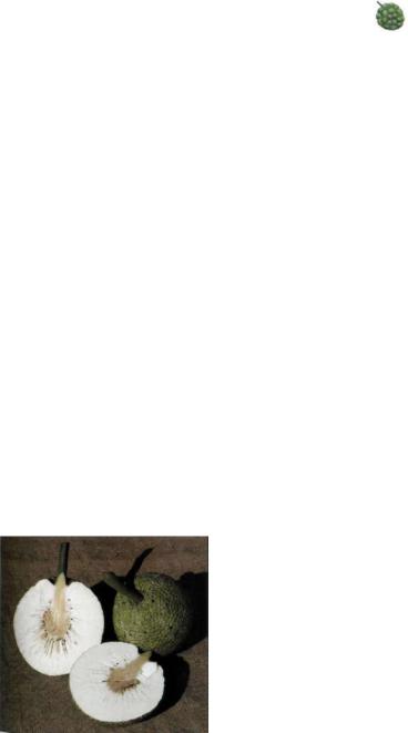 Плод. Соплодие хлебного дерева разви вается из всего женского соцветия в процес се того, как его осевая ткань вместе с утоп ленными в нее цветками вырастает в круг лый, до 30 см в диаметре или яйцевидный плод массой более 1 кг. Кожура зеленая или желто-зеленая, матовая, разделена на 4-6- угольники неправильной формы, каждый из которых образуется из отдельного цвет ка. У мягких, спелых плодов они легко отде ляются друг от друга. Многочисленные культурные сорта можно разделить на 2 группы, плоды и листья которых заметно различаются. У фертильных, образующих семена сортов на каждом сегменте кожуры