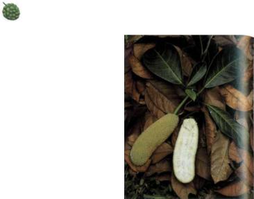Дуриан представляет собой вечнозеленое дерево с темными листьями и раскидисты ми ветвями, достигающее высоты 40 м. Его ланцетовидные цельнокрайние листья рас положены очередно, заострены и имеют